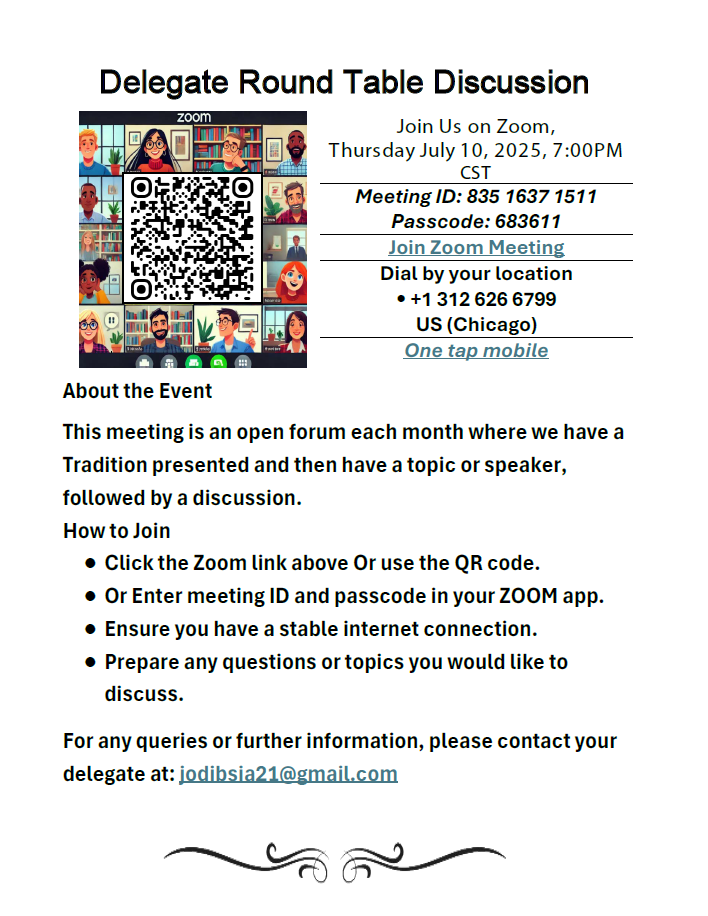 Monthly discussion forum with your area 21 panel 75 Delegate Jodi B. Discuss what’s important in your group, district, area, and AA