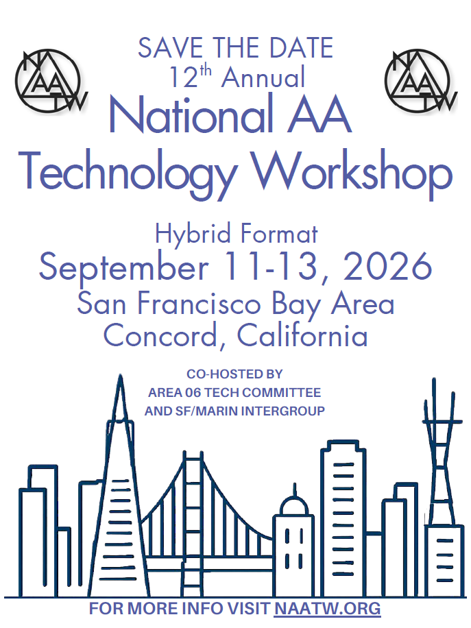 « All Events National AA Technology Workshop (HYBRID) September 11 @ 8:00 am – September 13 @ 5:00 pm STAY TUNED FOR MORE INFORMATION San Francisco Bay AreaConcord, California NAATW View Organizer Website AREA 6 View Organizer Website Add to calendar Google Calendar iCalendar Outlook 365 Outlook Live